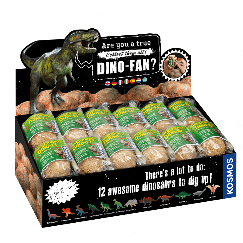 Kiekviename iš šių linksmų Dino kiaušinių rinkinių yra vienas plastikinis dinozaurų modelis. Kiaušiniai yra supakuoti, todėl nežinosite, kurią iš 12 dinozaurų figūrų Jūs gausite. Pridedamas nedidelis kalto įrankis, skirtas iškasti dino iš kiaušinio.