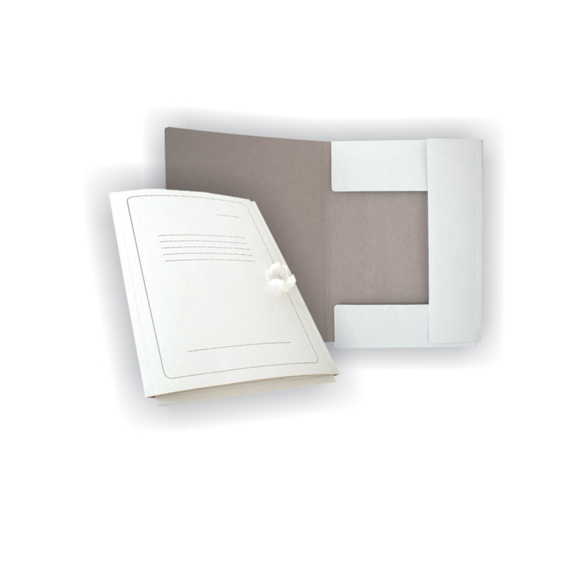 A4 formato baltas kartoninis aplankas su raišteliais, užlankstomoas iš trijų pusių.